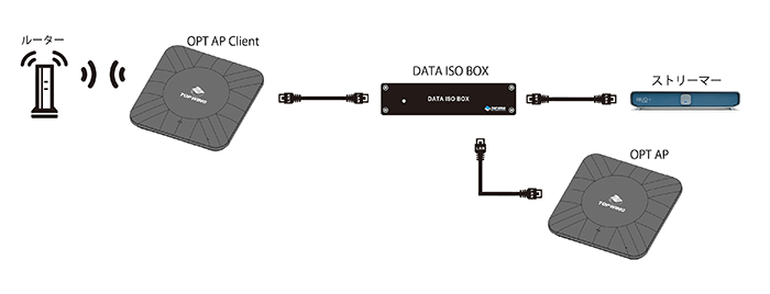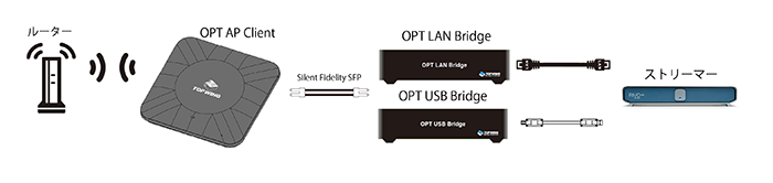 ◇ 使用例 ストリーマーを有線で使用: 無線通信は、常時処理や再送制御などの負荷が高く、オーディオ機器には不要なノイズの要因となります。 OPT AP Clientを使えば、無線でネットワークに接続しながら、ストリーマー側は有線で使用でき、音質的に有利です。 SFPポートを生かした光アイソレーション: OPT AP ClientにはSFPポートが搭載されているため、Silent Fidelity SFP、OPT LAN Bridge/USB Bridgeとの組み合わせで、簡単に無線→光→有線という高いアイソレーション構成へ発展できます。 電気的なノイズ経路を断ち、より静かなネットワーク伝送が可能になります。 DATA ISO BOXを用いたネットワーク分離: オーディオ専用ルーター・DATA ISO BOXは有線接続のみのため、設置場所が制限される場合がありました。 OPT AP Clientを使用すれば、DATA ISO BOXを上位ルーターに無線で接続できます。 音質劣化を最小限に抑えながら、ネットワーク分離の恩恵を最大限引き出せます。